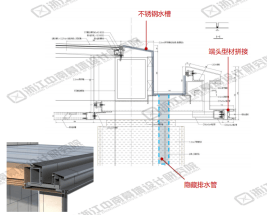 于幕墙设计而言,贯通连廊隐匿排水着实是一大难题。设计师在檐口处设置不锈钢集水凹槽,将排水管巧妙藏于立柱之中;保留部分自由排水功能,并于檐端加设防挂污型材拼接件,实现雨水的序列导流,确保廊道在多角度审视下的纤薄效果。