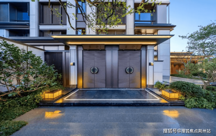 叠墅五层与六层转角处,皆做飞檐形态,轻盈中带有庄重;顶部飞檐及中部飞檐演绎曲檐翼角;飞檐底部以铜色铝板多层叠退,演绎宋式斗拱的支撑意象,既传承古制,又极尽现代工艺之精巧。