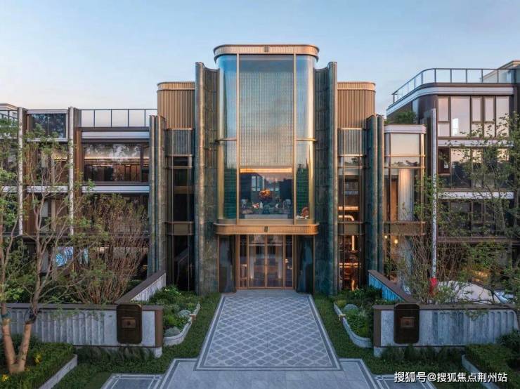 萃屿原墅立面采用大面积玻璃、金属线条、威斯康白石材,将松江新城的住宅建筑美学拉入下一个LEVE,尤其是香槟色金属线条如剪裁合体的高级西装骨架,勾勒出建筑的精致轮廓