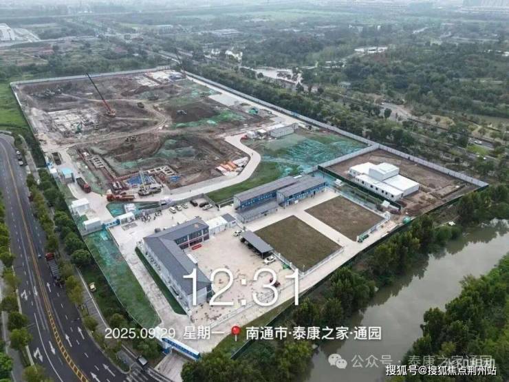 从高空俯瞰南通创新区这片热土,泰康之家·通园的建设现场正加速“生长”。挖掘机的轰鸣、错落的施工设施与周边绿意盎然的紫琅湖、公园景观交相辉映。