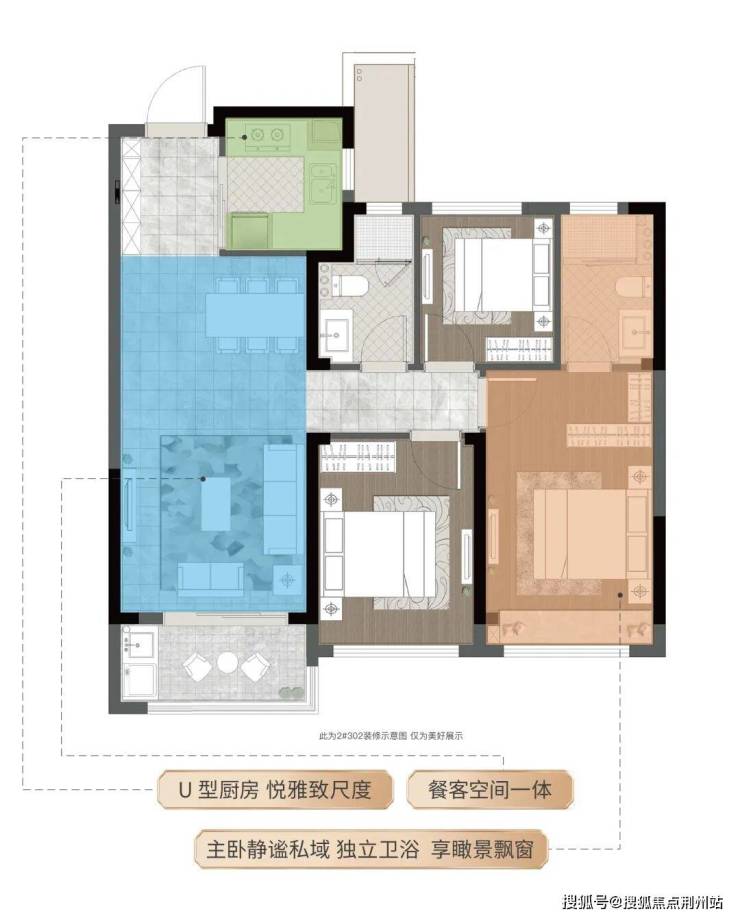 该户型以 “低总价 + 全功能”打破市中芯置业门槛:约 9.1 米南向面宽确保三室皆享阳光,U 型厨房与约 22㎡餐客一体空间形成高效生活动线,动静分区设计让主卧套房(约 7.4 米进深)与次卧、书房互不干扰,即便三口之家也能各得其所。