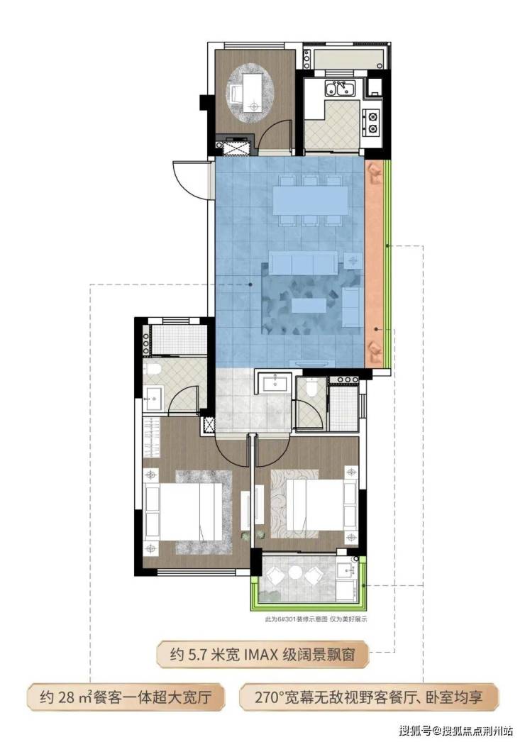 “270° 环幕视野 + 5.7m 巨幕飘窗” 定义观景尺度,三面均带景观窗,实现 “厅卧同享景” 的瞰景效果。