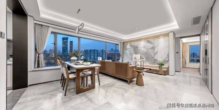 客餐厅连通约28㎡餐客一体空间,与 5.7m 面宽飘窗无缝衔接,无论是塘河波光、俯瞰城芯烟火,还是收纳江南园林叠景,景致随晨昏流转。