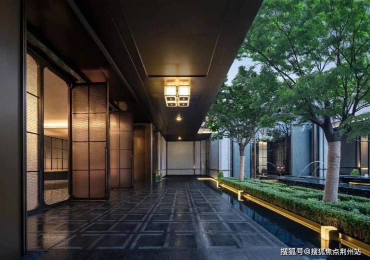 紫金·翡丽甲第的整个实体示范区是高度对称设计的:门口是很有对称仪式感的车马院,进门是高度对称的长廊水院,围绕着地面归家大堂展开的架空层、亭廊,以及围绕着下沉式庭院展开的会所空间,同样讲究「中轴对称」。