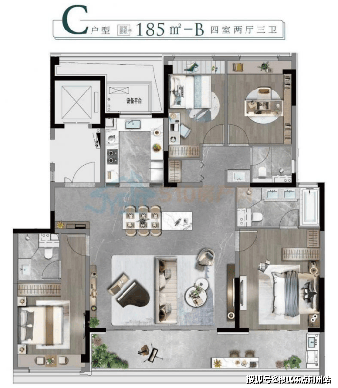 4房2厅3卫设计,北侧是房间+书房,南侧是两个朝南套房设计。