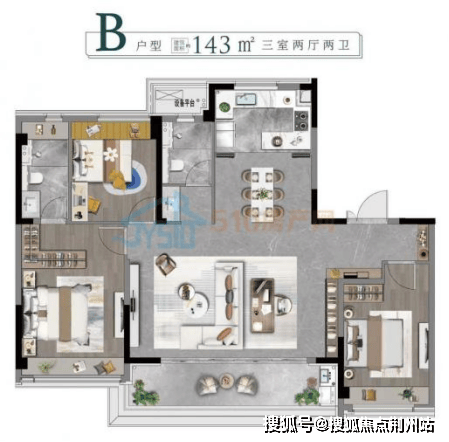143㎡三房设计,尺度更为奢阔。南北通透全明设计,大横厅、大阳台,视野无界,对于追求纯改善客群来说,这个户型真的很适合。
