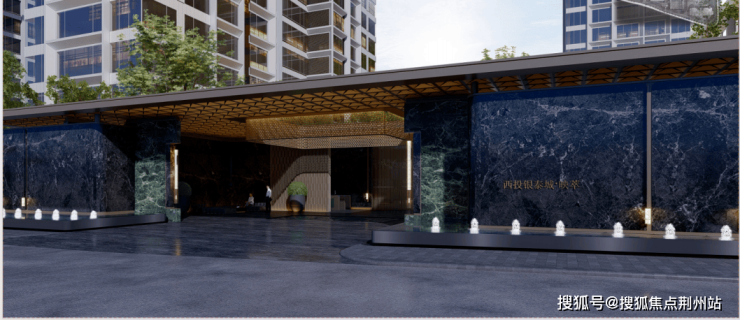 建筑立面现代挺拔,采用全铝板贴面,符合高端办公和公寓的配置,在此基础上,改造内容包括:大堂出入口、增加楼栋首层泛会所、增加公共会所泳池、优化园区标志性主入口。主入口采用干挂芬迪黑石材、普拉达绿石材、古铜色铝板等进口材料,整体现代且华贵,灯光点缀,调性高雅,近人尺度细节丰富,打造豪华入口,提升尊贵体验感。
