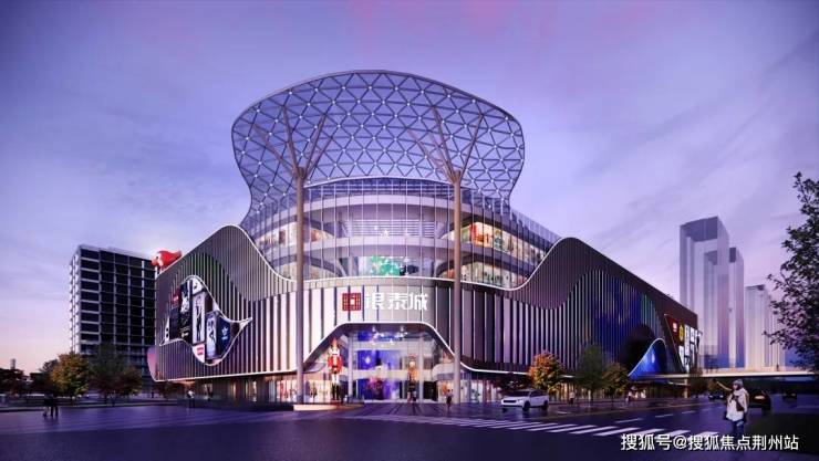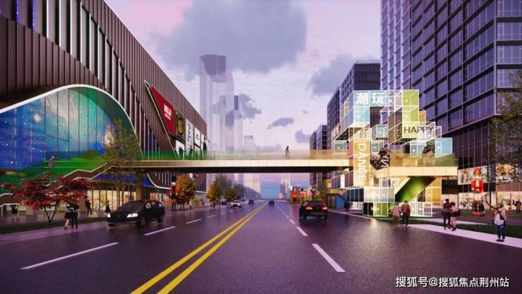 商业MALL采用超现代主义建筑设计风格,以时尚现代曲线铝板和玻璃组合为整体造型基调,顶部扩大曲线天幕遮阳造型,出入口增设超大LED屏幕,同时增加IP, 凸显时尚标志性的立面效果。线性LED灯带嵌入幕墙,夜间形成缤纷的灯光效果。以过街天桥连接商场和街区,加强南北区的交通联系。对商业屋顶设备增加格栅进行美化,提升第五立面效果。