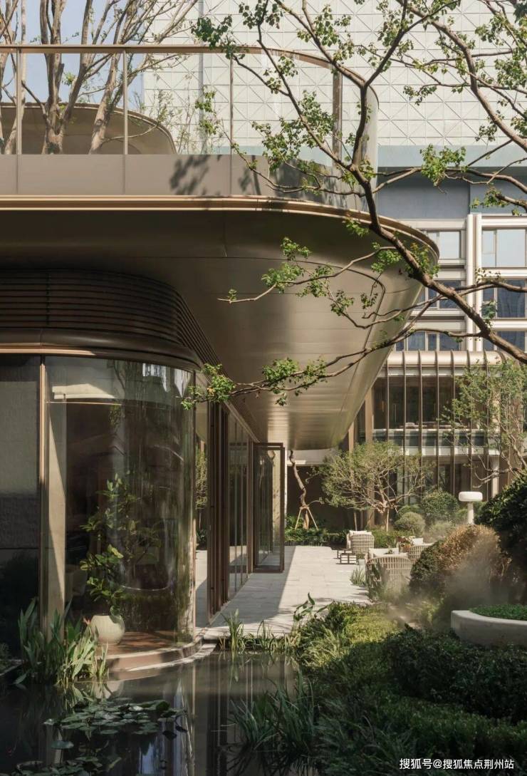 庭院景观以西湖荷花为核心设计元素之一,水桥的形态则借鉴并转译西溪湿地的自然肌理,使整体空间在文化意象与自然特征之间建立关联。