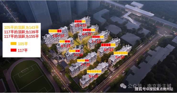 标准层105平和117平,105平的顶跃为143平,117平的顶跃为155平(1栋和7栋),剩余117平的顶跃为139平,户型楼栋分布如下图所示: