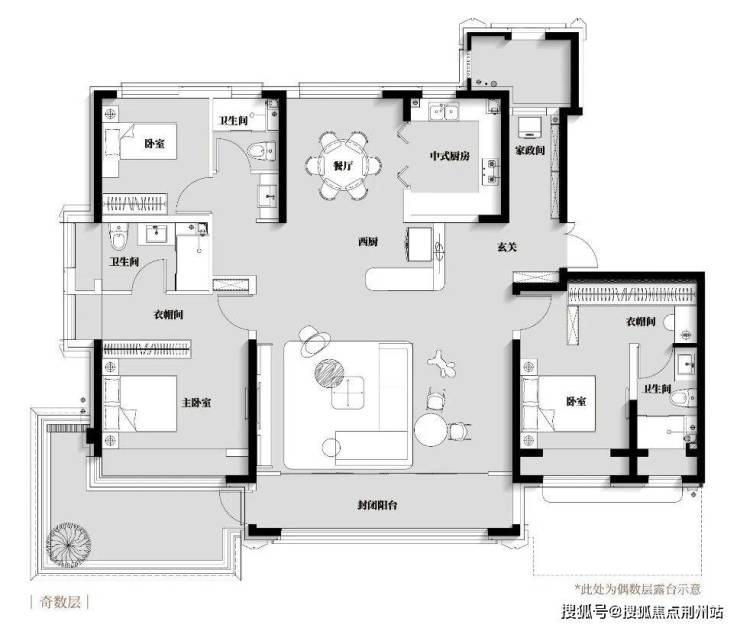 奇数层露台在主卧,270°转角设计;偶数层露台在南向次卧。