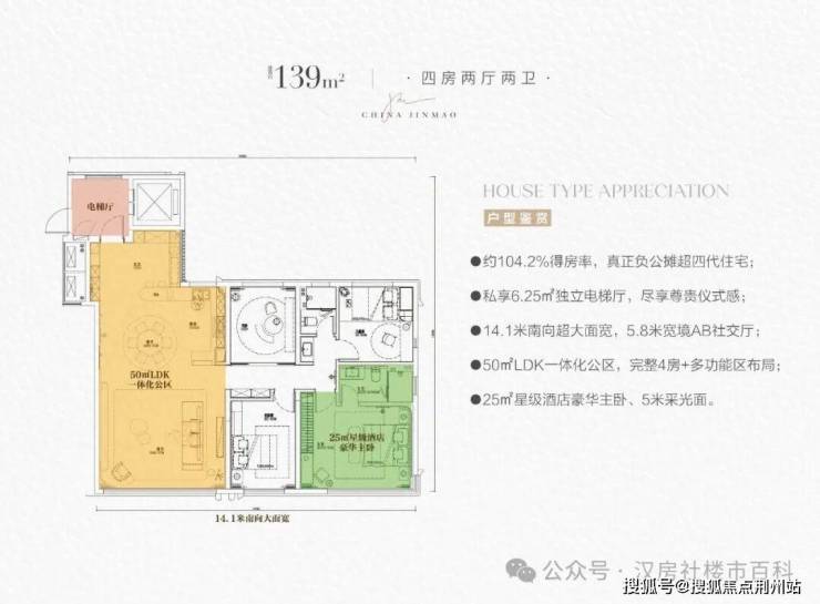 该户型位于1、2、4号楼的边户,户型方正且南北通透,三个开间朝南。这个户型有独立的电梯门厅,增加入户仪式感与专属感,也可作为临时储物、换鞋等过渡空间,拓展使用场景。104%的超高得房率和 50m²的LDK一体化公区,可以满足不同需求的多功能布局,相信这个户型应该会成为大多数高端改善型客户的首选户型。