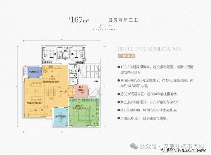 该户型位于3、5号楼,超 60㎡的洄游公区,且搭配 270 度全景端厅,不仅极大提升了室内的采光和通风效果,让居住空间更加明亮通透,还能提供广阔的视野,增强了居住的舒适感和品质感。独立电梯厅,不仅增加了额外的使用空间,方便业主放置鞋柜、雨具等物品,还提升了居住的私密性,减少了与邻居的相互干扰。虽然户型整体空间宽敞,但从布局上看,部分卧室距离公区较近,尤其是靠近全景端厅的卧室,在家人于公区活动时,可能会受到一定的噪音干扰,影响休息和睡眠质量。