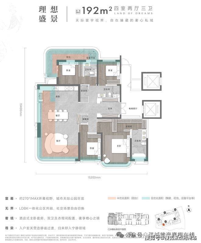空间尺度上:此户型做到了真正的三面采光,南向约15.2米采光面,采用大量全景落地窗,LDBK一体化动区的转角弧度阳台,不仅空间阔绰,环幕采光视野更是一绝;北向套房被阳台环绕,实现极为霸气的270度视野。
