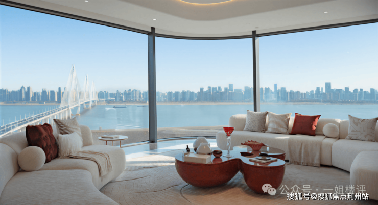 ②约95平一体化巨厅:这是推窗见江的最佳载体之一,巨幕全景落地窗相当霸气。如此奢阔的空间堪比一套三房两厅的小户型,这里包含了阔气餐厅、中西双厨、休闲品茶以及社交主场,商务待客、以江会友,视觉盛宴与商务牌面全都有了。