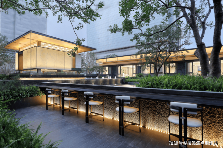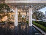 东大门的升级,是“加法哲学”最显著的宣言。将门庭从常规的约4米拔高至约6米,采用酒店式环岛落客门庭设计。主立面采用温润的米黄色尼克石大面积铺陈,中央镜面水景中涌泉不息,水中静立一株造型松。