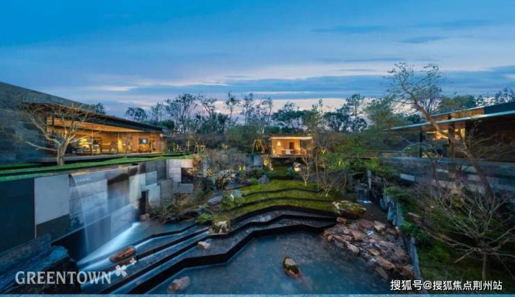 每个空间都与景观形成互动关系,书吧配备14米长、3.2米高的整面玻璃,正对瀑布景观,悬空茶亭浮于水面;泳池区域的泡池开窗借景,将外部树影引入室内。