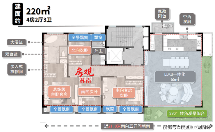 项目规划了21幢6-7层洋房,纯粹的低密住区。约220㎡一层一户户型4房2厅3卫,22米朝南超大开间,双套房设计,LDKG一体化设计,南北双阳台,另外全屋飘窗,动静分离,奢华舒适;双套房并且均为南向设计,终极改善豪宅的首选。