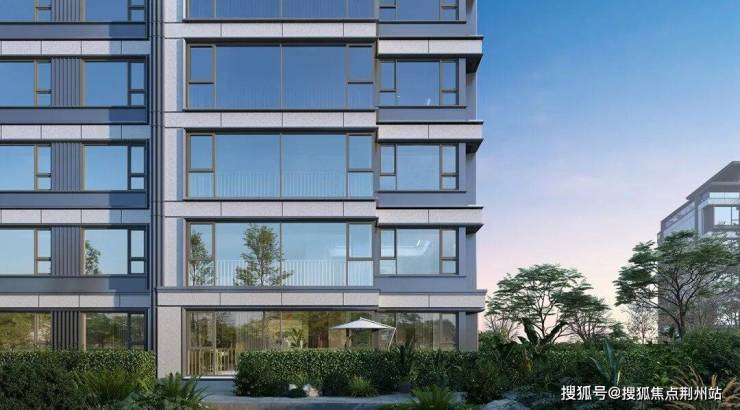 洋房外立面现代简约风格,六重精工体系,局部米白色石材、局部深灰色铝板、深灰色金属漆、米白色真石漆、三玻两腔中空low-e玻璃,配以超高窗墙比,大气美观。