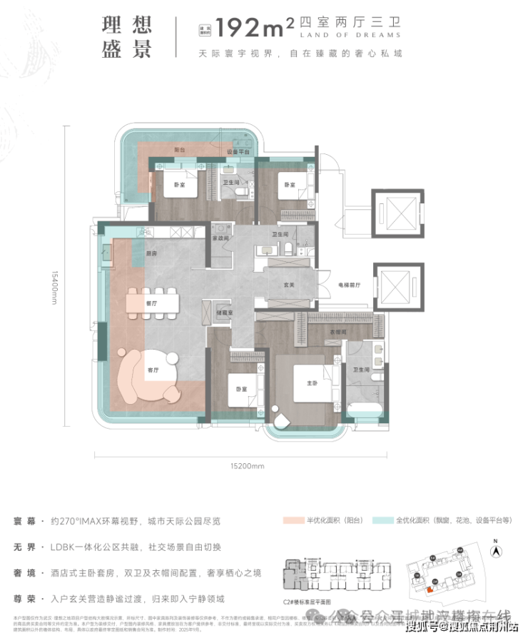 空间尺度上:此户型做到了真正的三面采光,南向约15.2米采光面,采用大量全景落地窗,LDBK一体化动区的转角弧度阳台,不仅空间阔绰,环幕采光视野更是一绝;北向套房被阳台环绕,实现极为霸气的270度视野。