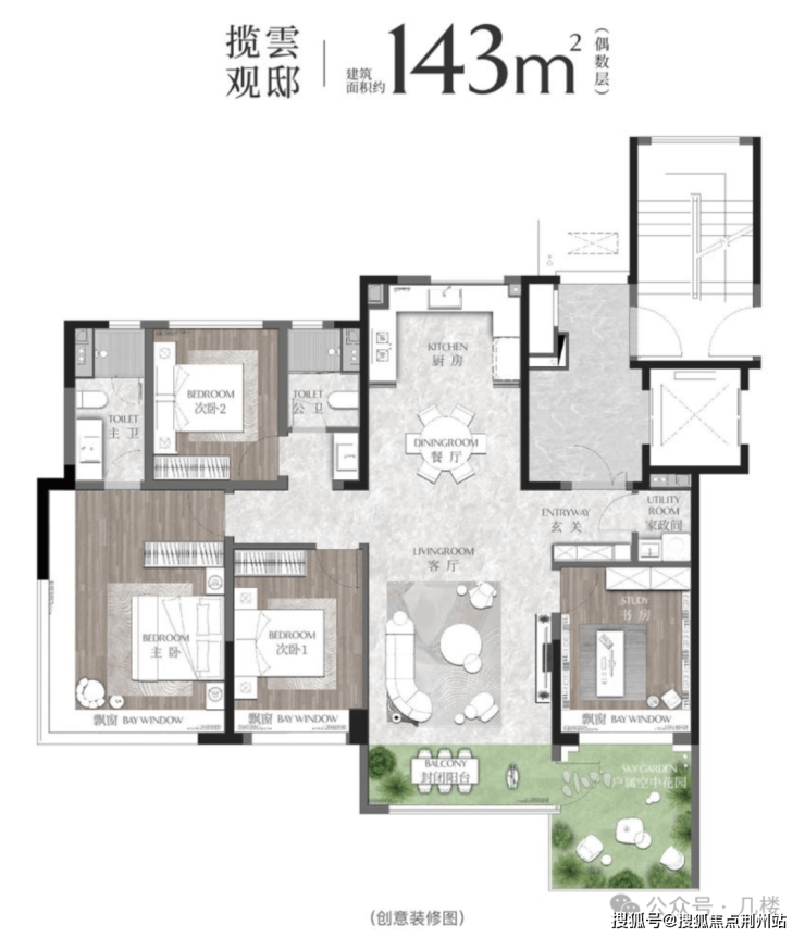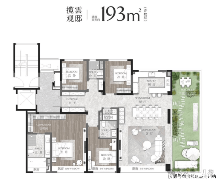 洋房产品,独立电梯厅,再加上大面积飘窗空间+空中花园,整个户型得房率极高,实用性自然更强。