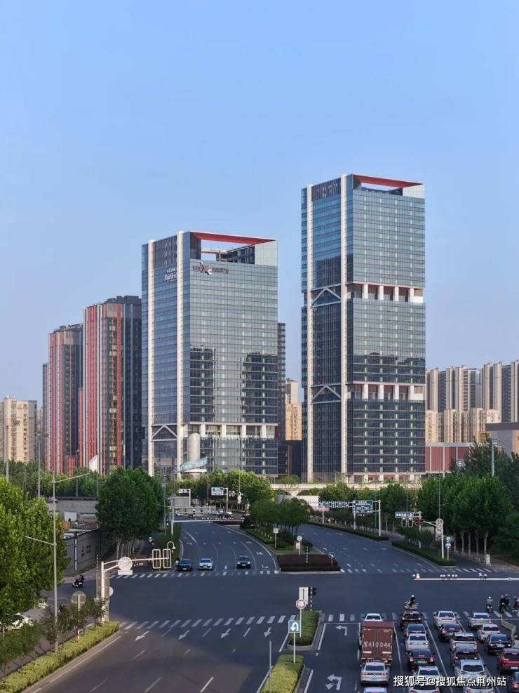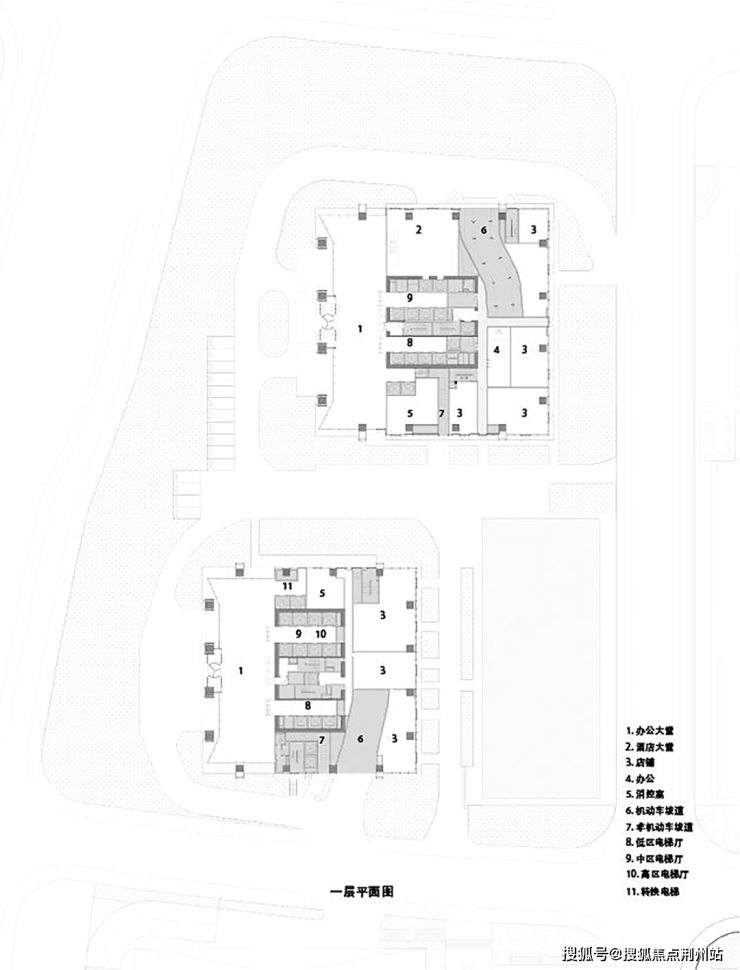 不同:双塔标准层控制在2 000 m2以内,以方正标准层保障办公效率,因此不做大的内收,仅在大堂、塔冠做局部切角,既呼应200 m塔楼的几何语言,又保证了办公空间的方正好用。