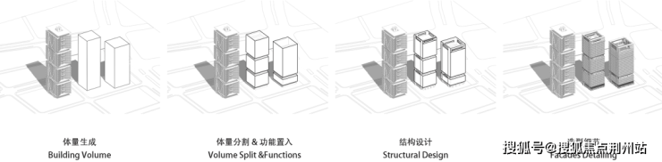 双塔紧邻已经确定方案的200 m塔楼,三栋楼需要协调统一,200 m塔楼以“视窗”为设计出发点,双塔既要和其协调,又需要有自身的特点,造价也有不同,所以这是一次“限制中的设计”,也是一张有轮廓之后的画作。