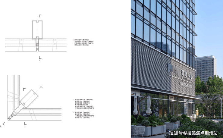 设计通过精准控制,在幕墙单方造价不超1 500元/m2的限制下,实现了高完成度。造价的分配:占主要立面的标准段要极限的将造价控制,才能在底部等近人尺度的地方用更好的材料提升效果。标准段框架式,以金属开启扇调节玻璃尺寸(≤4 m2)并增加层次,上下单元的脱离降低了对施工平整度的要求。