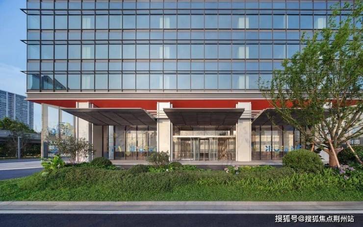 大堂区域设计采用夹胶超白玻璃,相对中空玻璃能降低造价,同时提升大堂的通透观感。室内采用T型精致钢立柱,弱化内侧体量感。同时,精致钢承担门斗的部分竖向荷载,以此取消门斗钢立柱。主入口立柱以约9 m通高铝复合板覆面,两柱之间外挑不锈钢雨棚,形成丰富的空间关系。