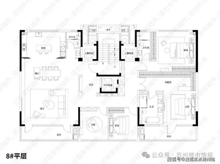 为本次产品亮点之一,采用私家电梯入户,实现“一层一世界”。约20.8米南向五开间面宽,约55.2平方米的宽敞方正客厅(方厅),南北两侧均设置带独立卫浴的套房,主卧空间开阔。