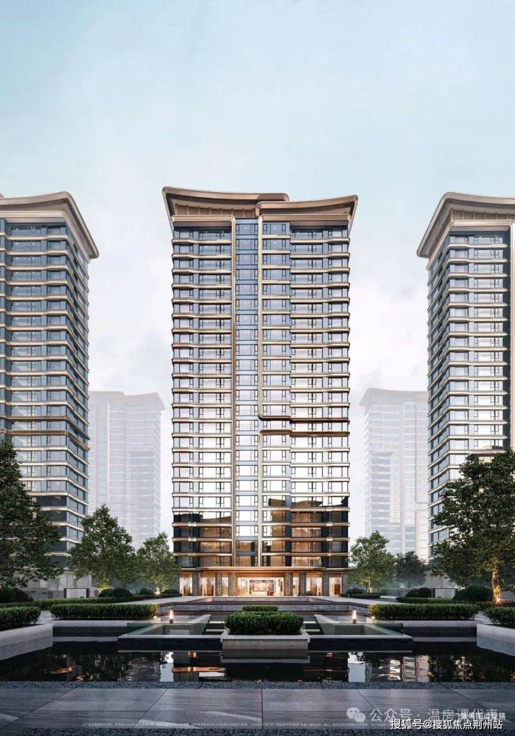 建筑立面以观澜屏玻璃立面辉映江水波澜与天际浩瀚,香槟金格栅是鎏金显贵,黄金缕线条流畅灵动,新中式韵律之美点缀CBD天际线。