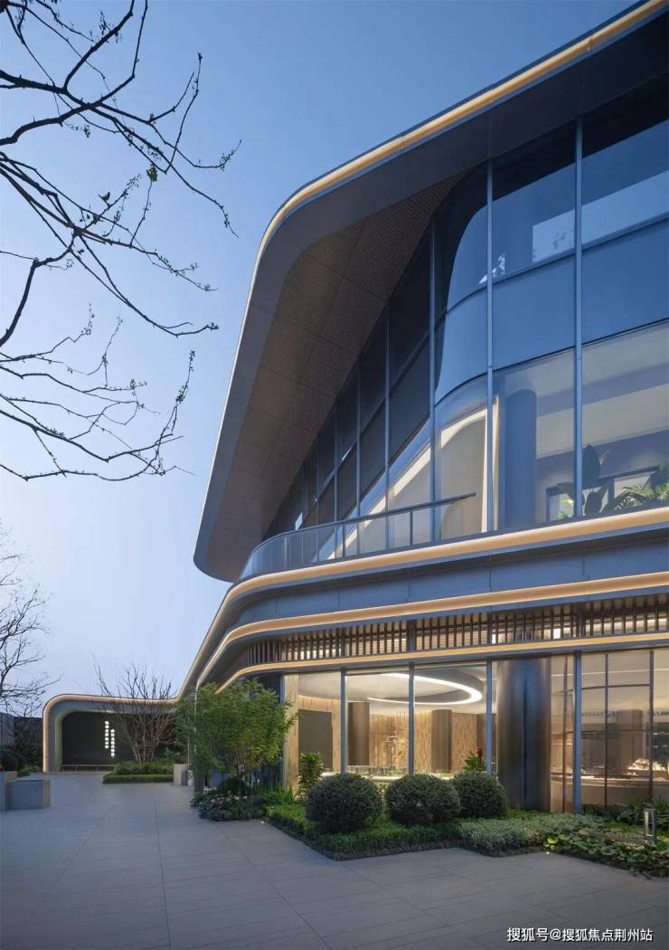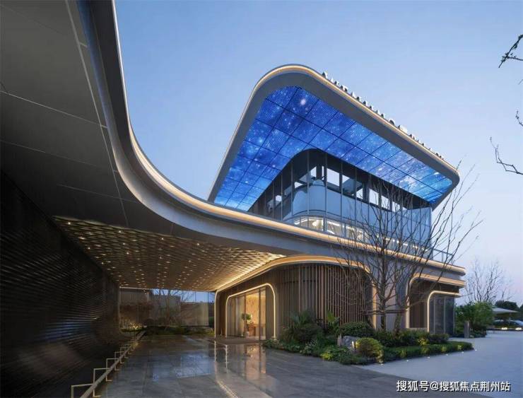 建筑主体以银灰色金属和超白玻璃为主要材料,配合曲线造型,彰显现代性与时尚感,赋予建筑更多的浪漫色彩。暖色穿孔铝板大面积运用在面对城市的界面,配合星座造型的点点灯光,仿佛社区里万家灯火的汇聚。
