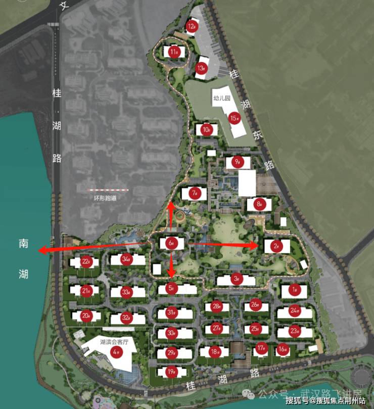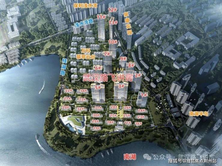 从地块来看,北面狭窄,南面比较方正。南面一线临湖以洋房为主,北面高层为主。而北面的1、3、5号楼为第一排高层,高层可以无遮挡看湖,湖景效果非常好。而6、7、10、11号楼可以西侧看南湖,8、9号楼相对看湖效果最弱。