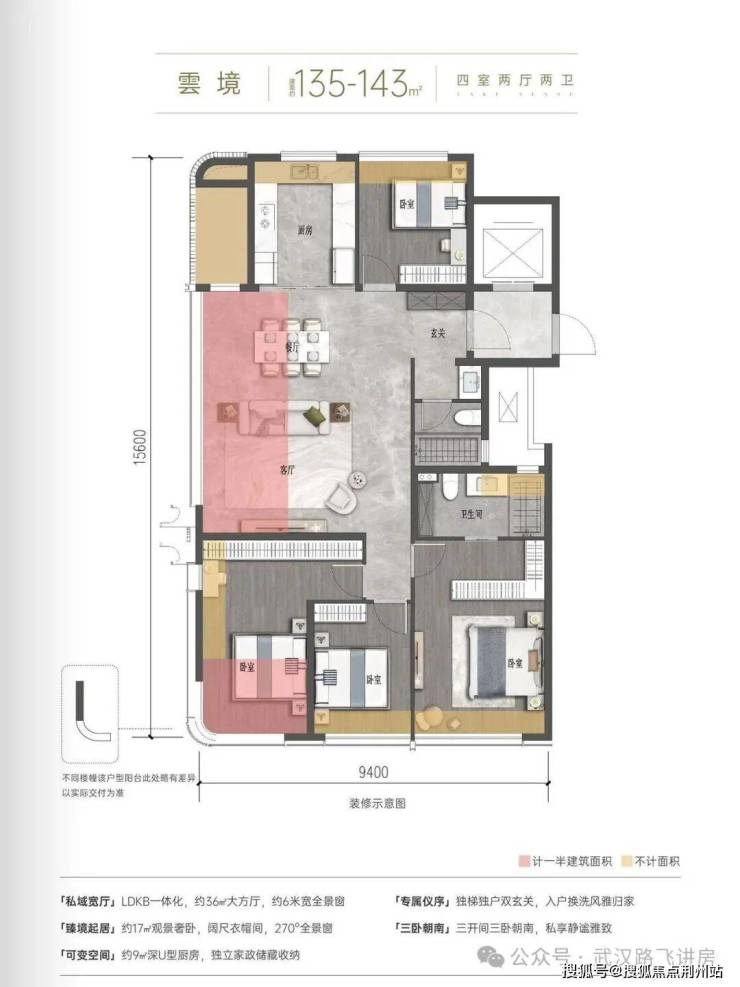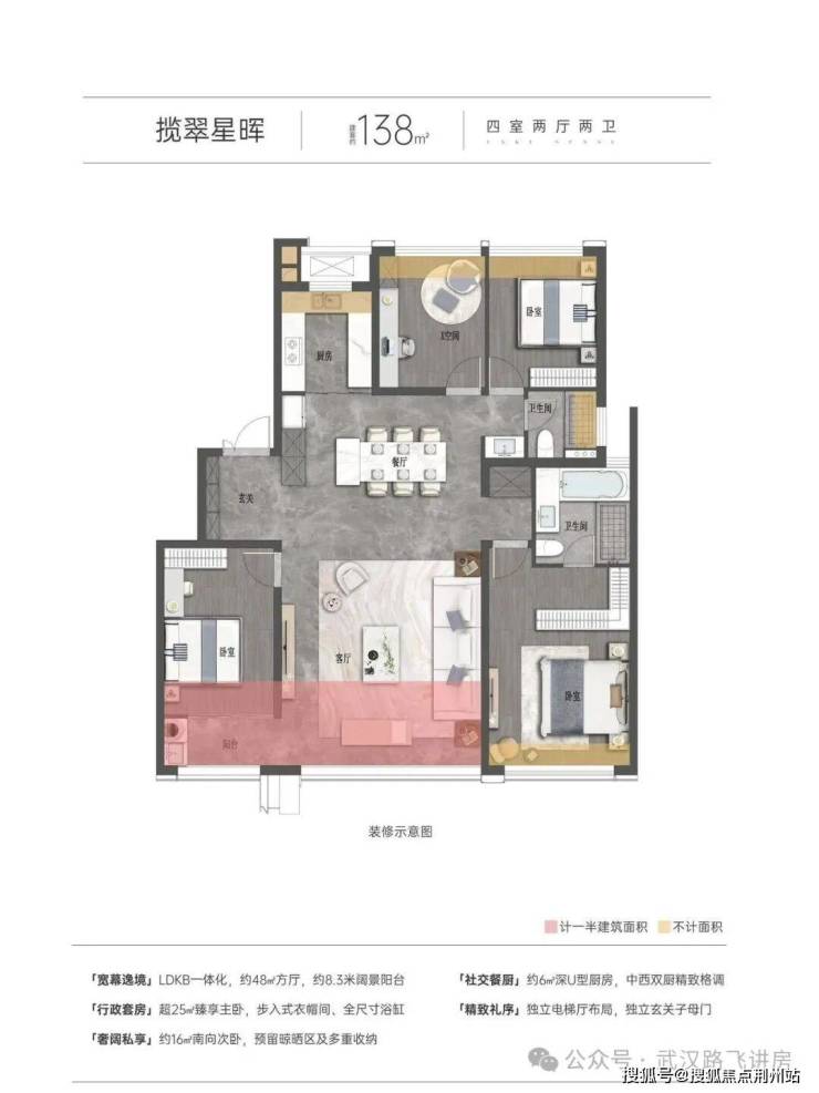 高层建面约111-143平房源,既有功能性三房两卫(建面约111平)、也有舒适性三房两卫(建面约127平)、功能性舒适性兼得的极致四房(建面约143平)更是绝绝子。
