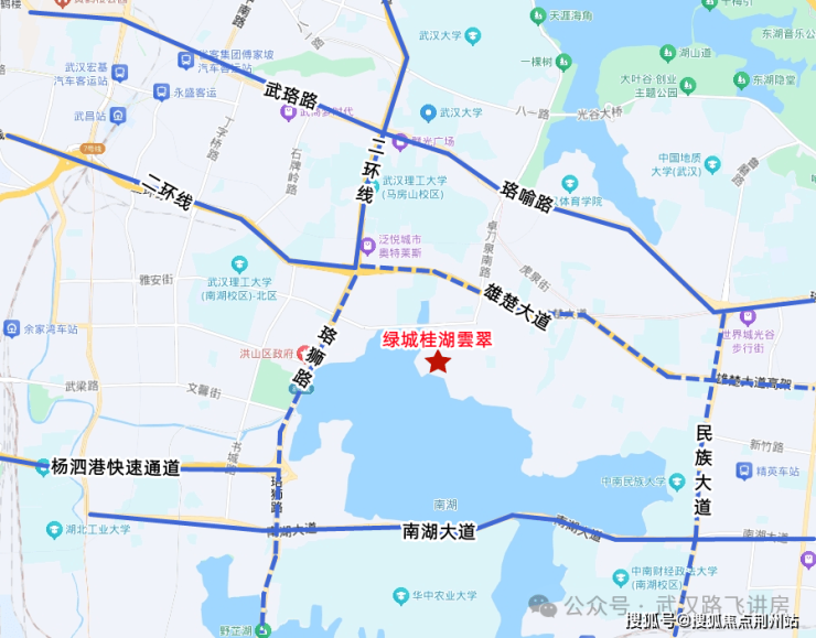 绿城桂湖雲翠位于洪山区南湖北岸,桂湖路北侧。它属于南湖板块,也可以算是雄楚大道板块。项目一线临南湖,距离雄楚大道直线仅约1公里,距离珞狮南路约1.3公里。