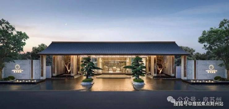 凤起冕旒|东方礼序的当代演绎;主入口门头以古代礼冠“冕旒”为灵感,采用现代设计语汇,构筑约85米“凤起冕旒”华贵门仪。景泰蓝垂幕「旒珠振玉」镶嵌其间,既呼应传统东方礼制,亦致敬苏州的时代封面与源点气质。门庭景观取罗汉松、朴树等珍稀树种,将奢石、水景与自然精巧融合,构筑一方承袭千年盛韵的尊荣之境。