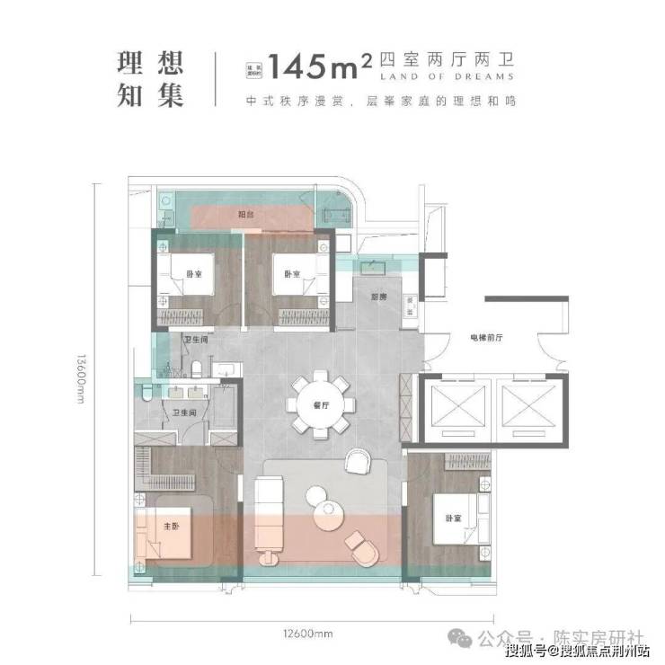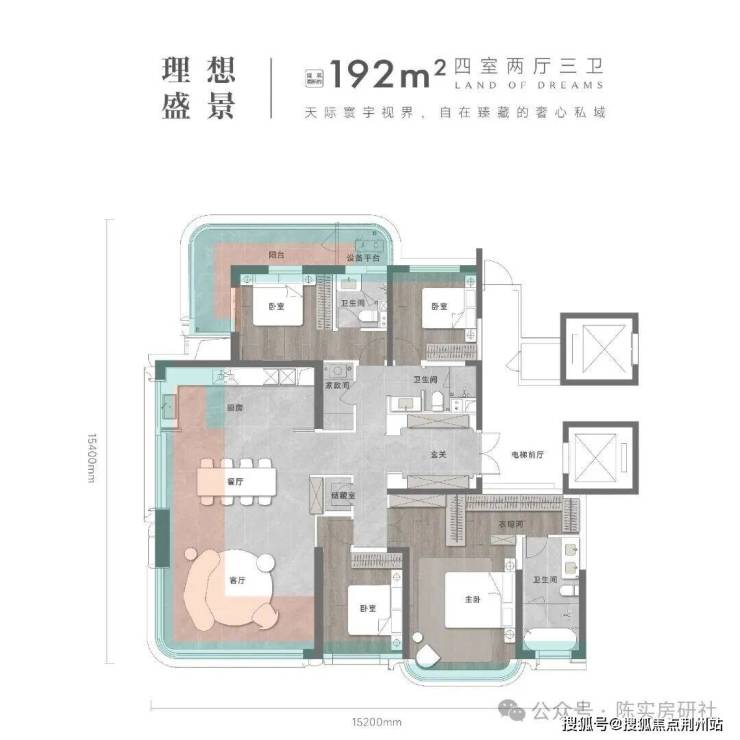 该户型位于3号楼边户,南北通透且三面采光,三开间朝南,包含大横厅及两个卧室,约12.6米南向采光面,再配以约3.1米的层高;另外北侧阳台做了弧形设计,可实现270度观景。