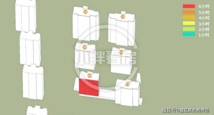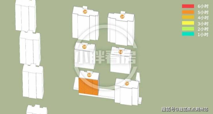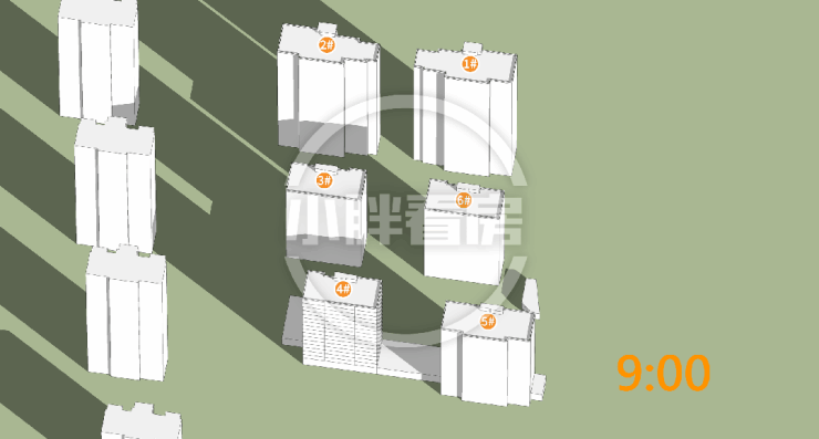 夏季:由于楼栋建筑朝向为西南偏转和夏季太阳角度原因,楼栋在上午处于阴影中,日照时长有相应折损。