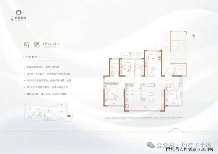 建面约140平四室两厅两卫,主要分布在小高层上,针对不同需求设计三款户型,亮点也很多,如独立电梯厅、独立玄关空间,南向约14米面宽,最大约7.35米南向双阳台,南向四面宽,LDKB一体化空间设计,北向还有设备平台,等等,虽然三个户型略有不同,但各有特色。