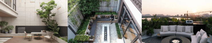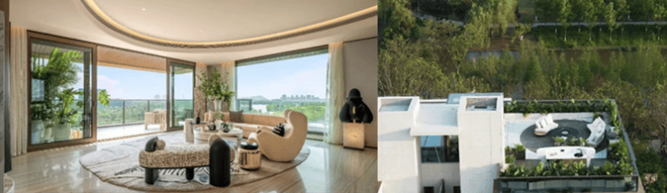 中间户聚焦垂直院落系统打造:如下沉庭院(会客)+地面庭院(社交)+屋顶花园(私密观景)的多维度/分功能设计