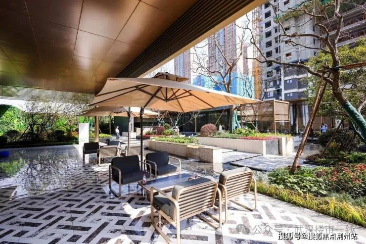 度假酒店式水景庭院,两条归家动线,风雨连廊连通中庭会客厅、入户大堂,诸多匠心独运之处,令人印象深刻。