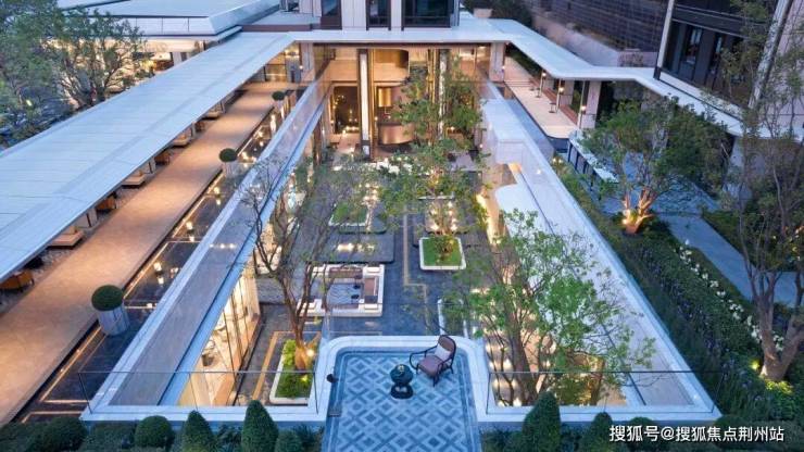 下沉庭院以约6.15米高的悬挑水帘、水中下沉卡座,构筑行走于水上的通行体验,与地下配套用房对话。地上地下的双园驱动,以直径约2.5米的雅典黑金花水钵为起点,以直径约2米的黄金麻整石水钵为终点,通过金澜线条的延续,串联景观故事线,回应湖映金沙的营销价值。