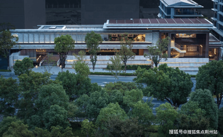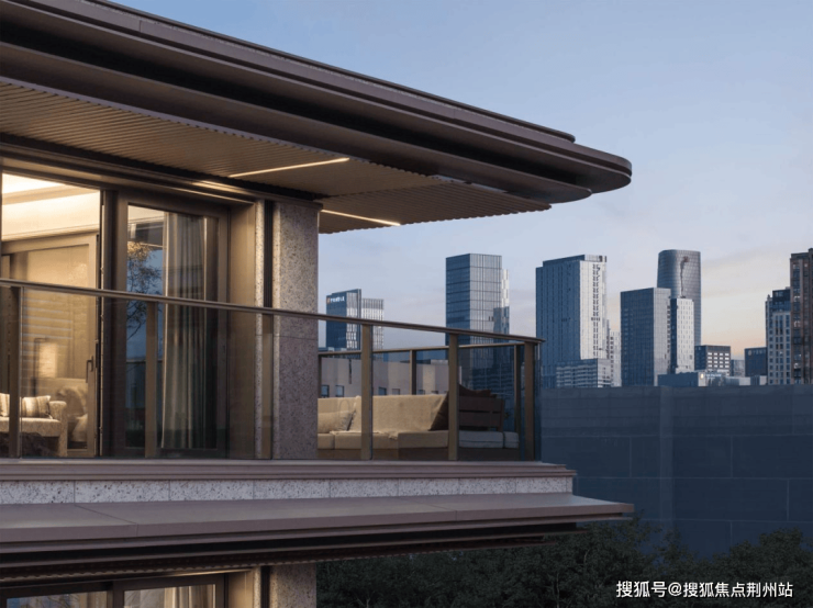 合院采用“超流体”风格的立面线条,搭配金色美学设计以及独特的“木纹转印铝格栅”,让建筑呈现轻盈灵动的未来感。