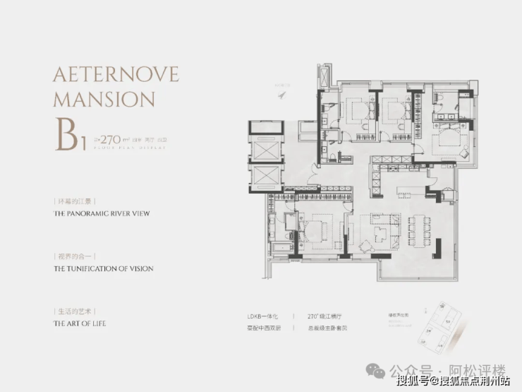 观江方面,该户型两个卧室、客餐厅都有非常好的观江视野,尤其是客餐厅和东北角主卧都做到了270°观江视野,南向主卧可以正面观江,甚至卫生间都可以看江。
