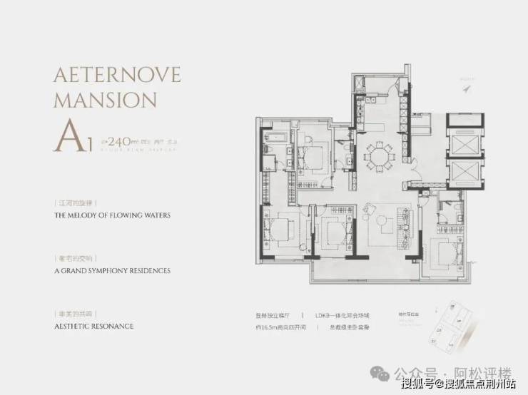 户型设计上,该户型四房设计,甚至有改造为五房的条件(南向主卧和客厅之间可以隔出一间房),做了四个卫生间,三个卧室均带独立卫生间,南向和东南向卧室都可以做主卧;面积优化方面,独立电梯前室,客餐厅270°拐角大阳台,部分房间带飘窗,相较于240平房源优化面积更多。