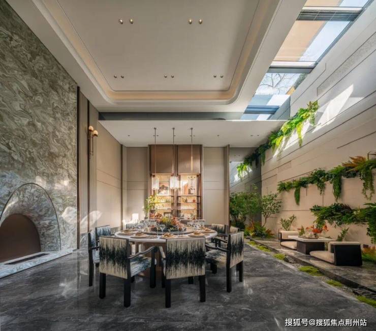 在室内,197方建面的溪韵满庐南向开间10.5米,堪比市面上250-300方排屋尺度。所以餐客厅的大平层感显而易见,边套中室内外交融,采光通透更甚。
