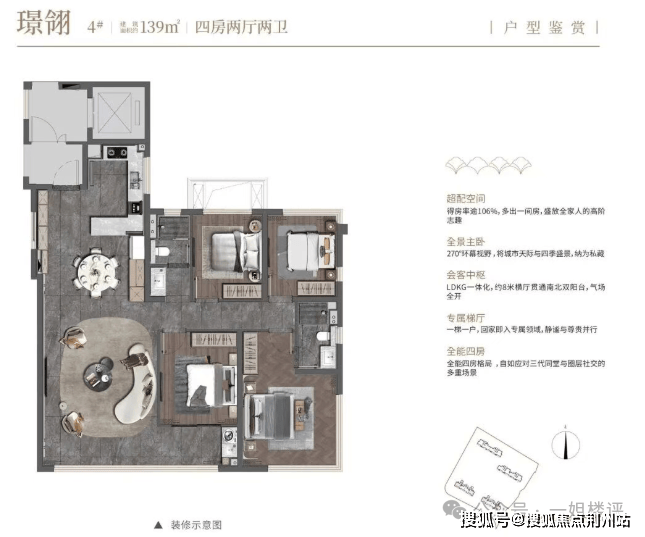 建面约139平四房就是三代同堂的优选了。全能四房格局,优化后约106%的得房率,室内空间超越一些建面约160平以上的豪宅。