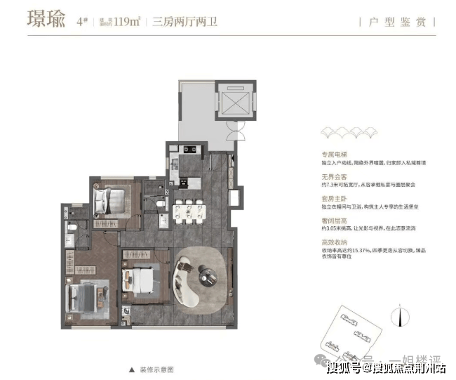 建面约119平房阔绰三房则是武昌内环核心即将入市楼盘中唯一的小面积四代户型,也是年底武昌核心大决战中上车门槛极具优势的房源,主打实用舒适,让你首次置业就有改善的尺度。