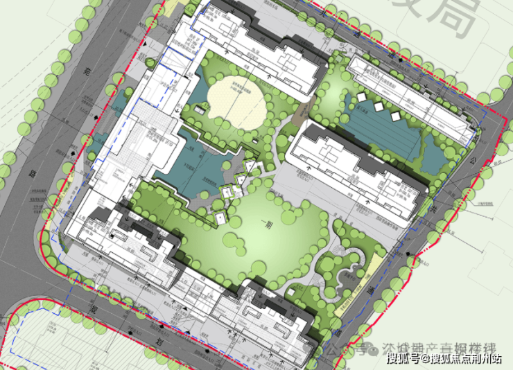 可以看到,项目1、2号楼之间的楼间距约90米,3、4号楼之间也有约65米的间距,而且东西向的纵深也达到约100米,形成完整且方正的园林。