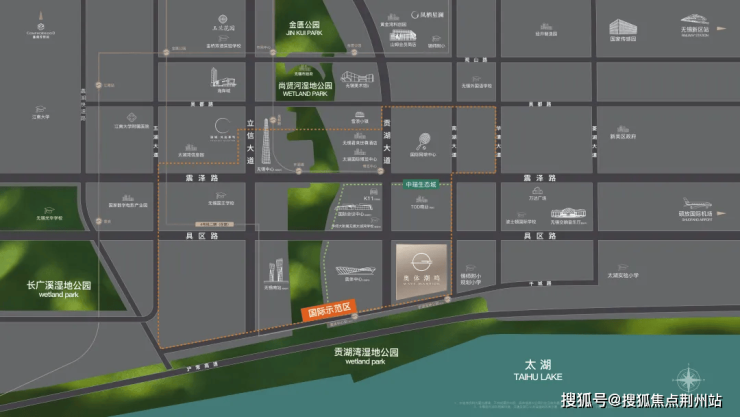 地理位置:地处滨湖区南湖大道与干城路交叉口正西方向276米左右,紧邻无锡奥体中心,一线太湖湾岸,约500米近享亲湖优势,尚贤河湿地公园、贡湖湾湿地公园交汇。